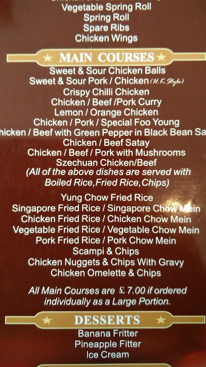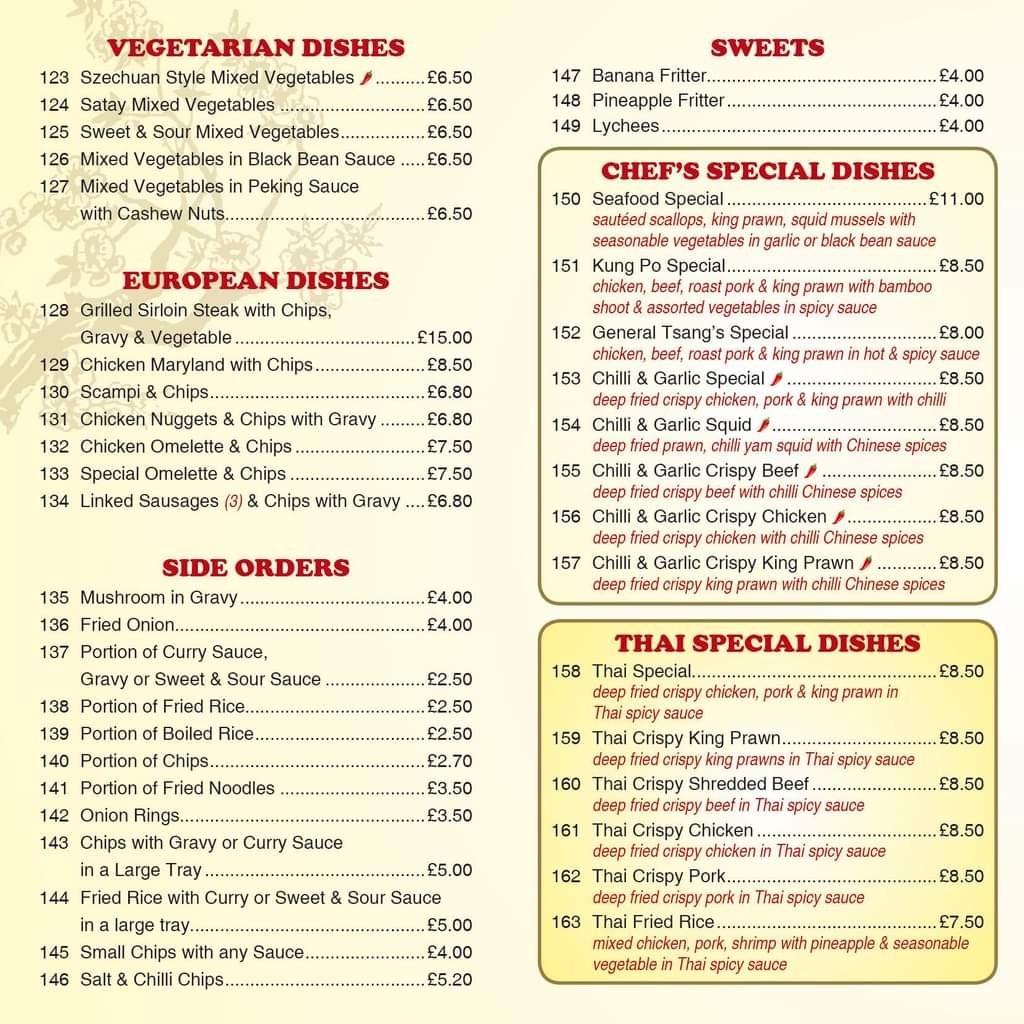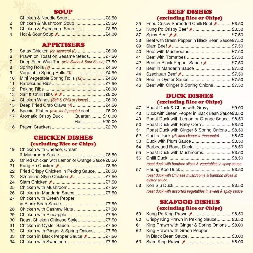 You’ll find comforting and familiar options like Singapore Chow Mein, crispy vegetable spring rolls, and a variety of hearty duck and beef dishes prepared with classic sauces and seasonings. The mix of noodles, rice dishes, and tasty starters fits well with the informal, no-fuss atmosphere of the restaurant, where the focus is on simple, honest flavors served promptly.